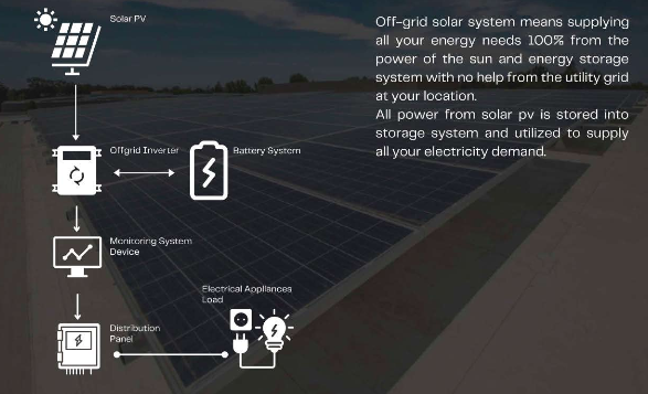 Sistem Solar tanpa terhubung ke jaringan PLN (Offgrid) dapat bekerja secara mandiri tanpa ketergantungan pada jaringan listrik. Sistem ini akan mengurangi biaya interkoneksi untuk terhubung ke jaringan listrik (PLN) terdekat dan juga menghilangkan biaya operasional jika dibandingkan dengan menggunakan mesin diesel.